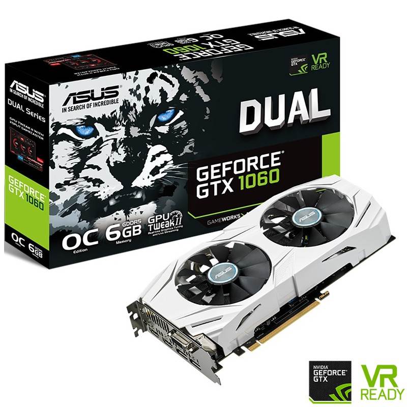 | ASUS GeForce GTX 1060 DUAL OC 6GB Video Card - 6GB 192 bit GDDR5 - GPU Clock Boost/Base: OC Mode: 1809MHz/1594MHz, Gaming Mode (Default): 1784MHz/1569MHz - Memory Clock: 8008MHz - 2x DisplayPort (Version 1.4), 2x HDMI (Version 2.0), 1x Dual-Link DVI-D - PCI-E 3.0 x16 - 6-pin Power - Nvidia Ansel, Nvidia G-Sync, Nvidia GameWorks, Nvidia GPU Boost 3.0, Vulkan API - DirectX 12, OpenGL 4.5 - 3 Years Limited Warranty |