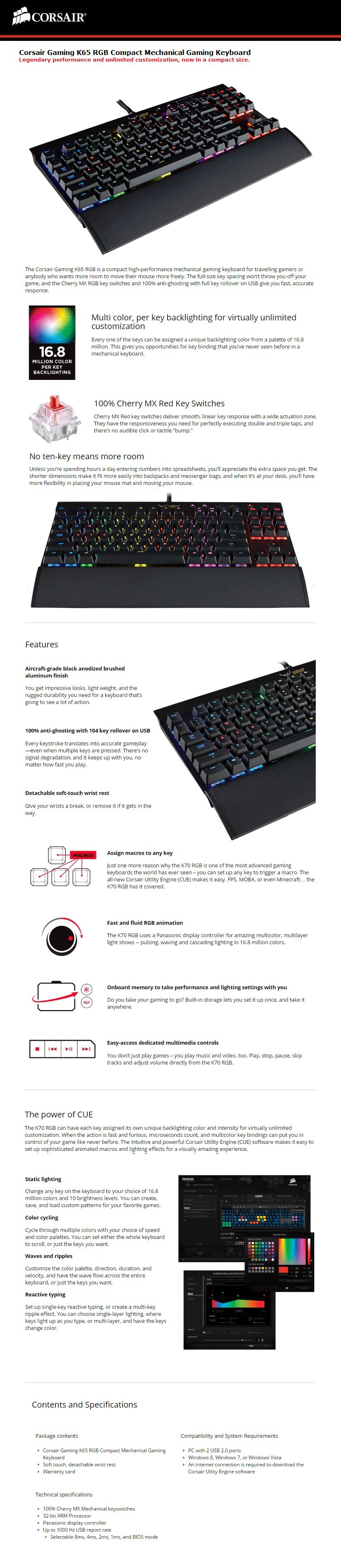 Corsair Gaming K65 RGB LED Mechanical Gaming Keyboard - Cherry MX Red - Multi-color Backlighting - 100% Anti-ghosting with 104 Key Rollover - USB - Color: Black - CH-9000072-NA