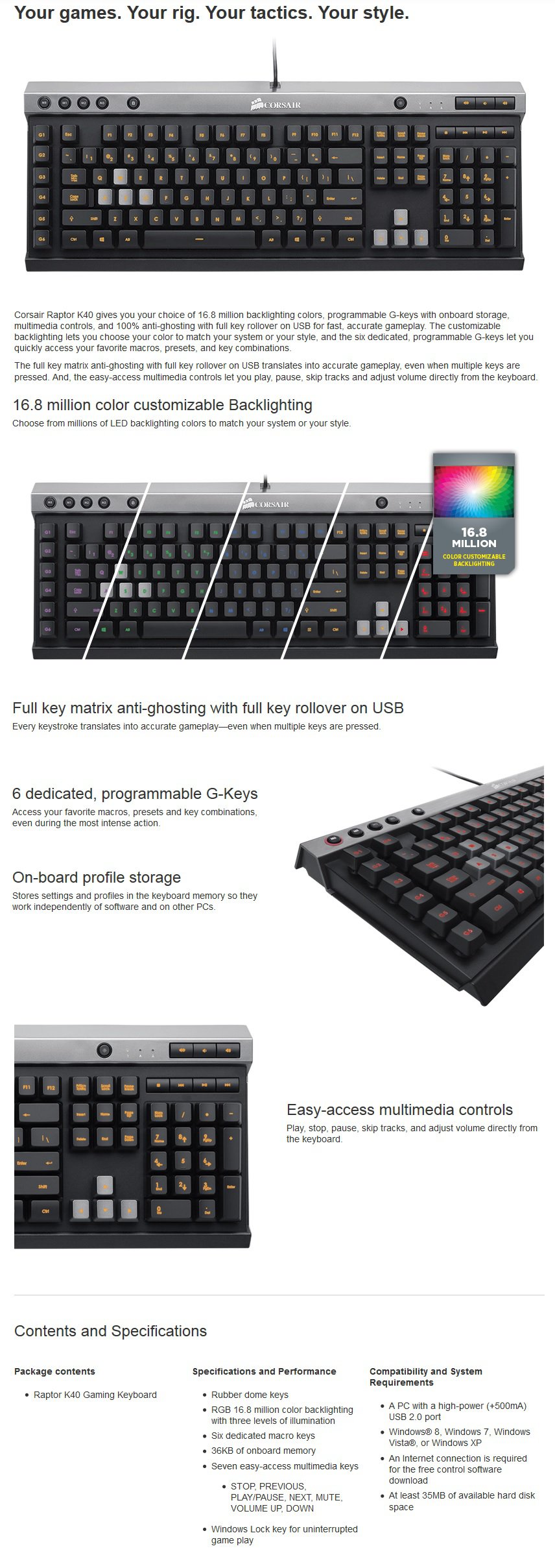 Corsair Raptor Series K40 Gaming Keyboard - 36KB of Onboard Memory - Rubber Dome keys - 6 Programmable Gaming Keys - 18 Programmable Functions - 100% Anti-ghosting - Full key rollover - RGB 16.8 M Color Customizable Backlighting