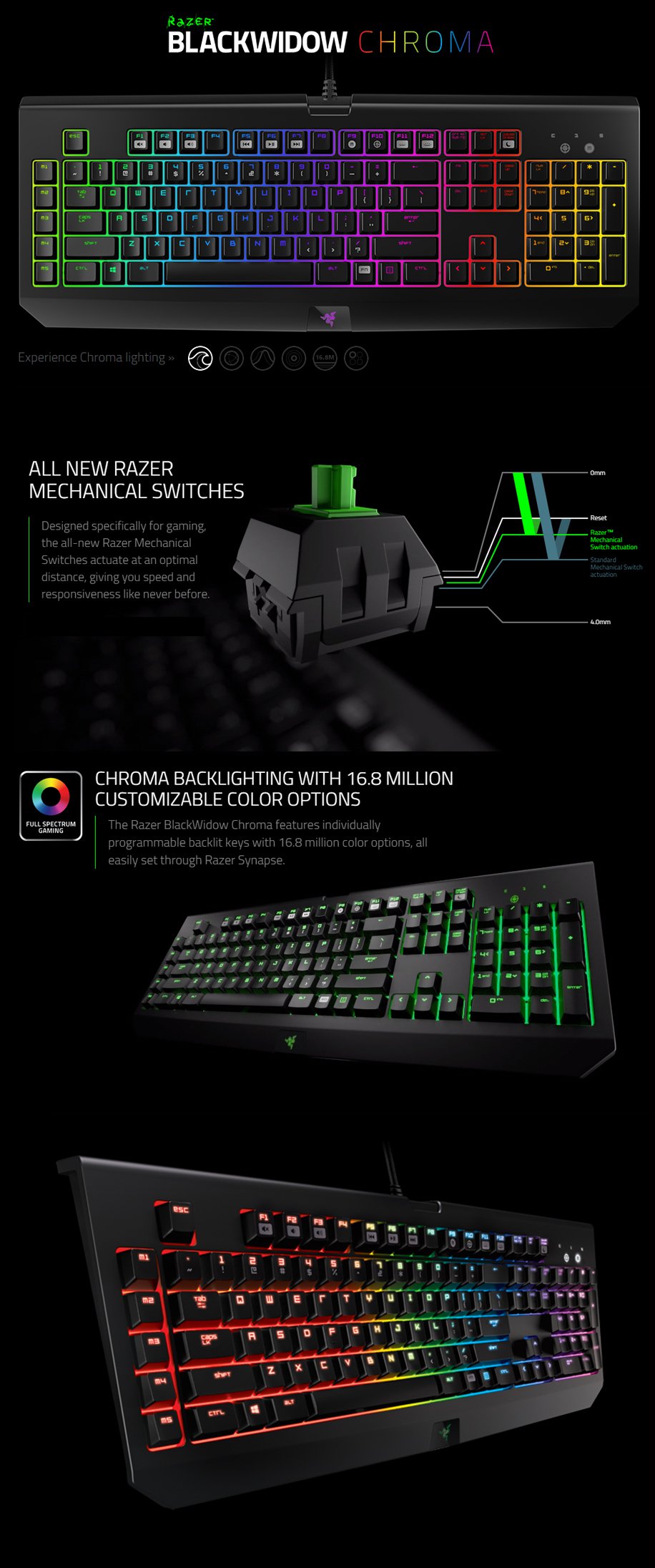 Razer BlackWidow Chroma RGB Mechanical Gaming Keyboard - Razer Green Switch - Clicky keys with optimized tactile feel - 16.8 Million Customizable Colour Options - 1000Hz Ultrapolling - 60 Million Keystroke Life Span - 10 Key Roll-Over Anti-Ghosting - Fully Programmable Keys with on-the-fly Macro Recording - 5 Additional Dedicated Macro Keys - Audio-out/mic-in jacks - USB Pass-Through - USB - US Keyboard Layout