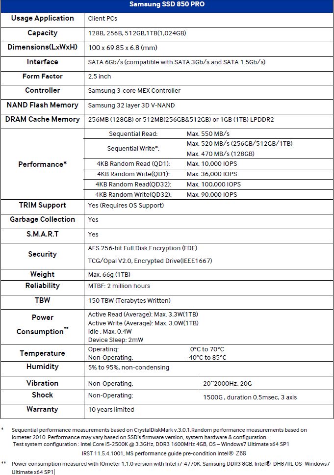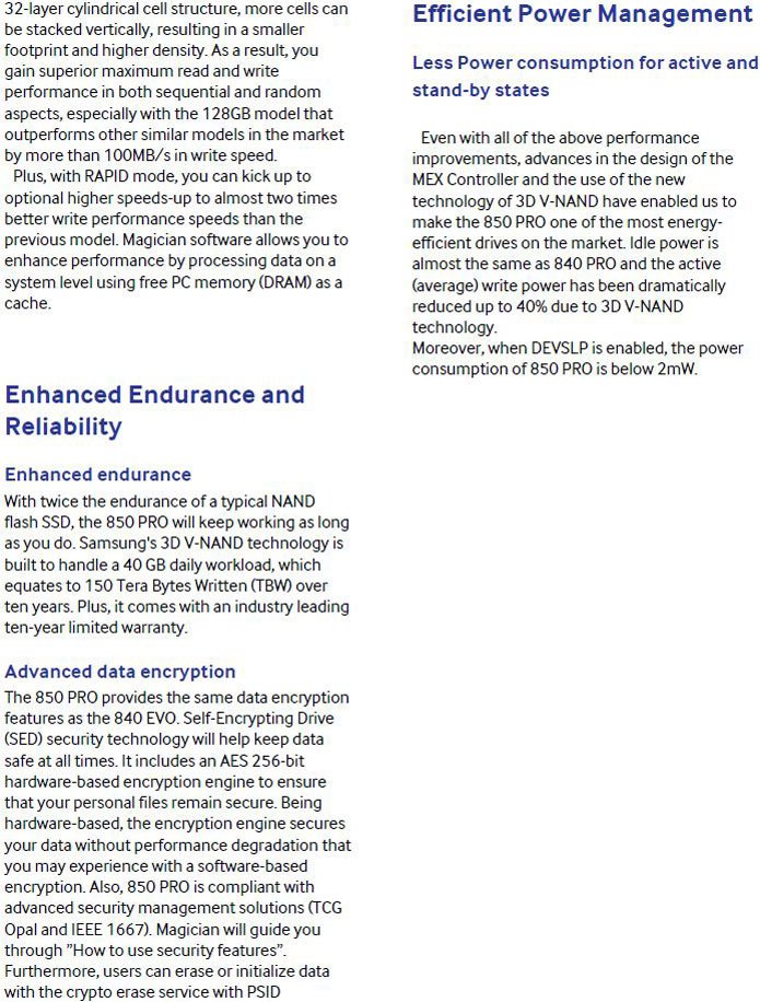 With twice the endurance of the previous model, the 850 PRO will keep working as long as you do. It features sequential read speeds of up to 550MB/s, sequential write speeds up to 520MB/s, has a 256GB capacity and a Samsung 3-core MEX controller. Samsung's V-NAND technology is built to handle 150 Terabytes Written which equates to a 40GB daily read/write workload over a 10-year period. Plus, it comes with the industry's top-level ten-year limited warranty.