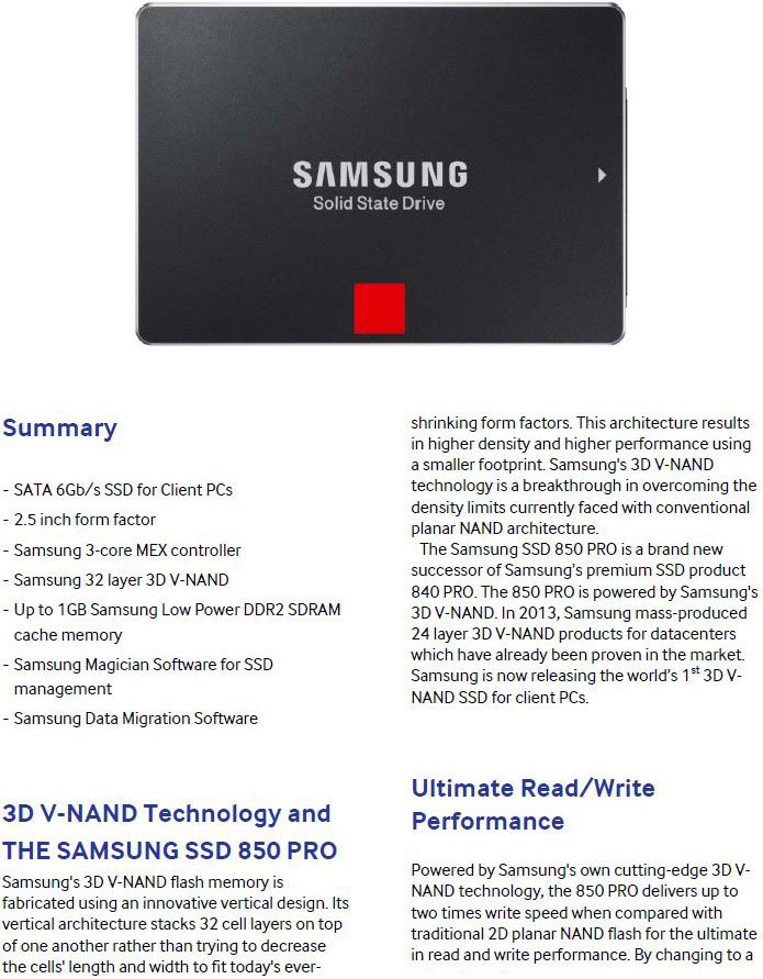 With twice the endurance of the previous model, the 850 PRO will keep working as long as you do. It features sequential read speeds of up to 550MB/s, sequential write speeds up to 520MB/s, a 1TB capacity and a Samsung 3-core MEX controller. Samsung's V-NAND technology is built to handle 150 Terabytes Written which equates to a 40GB daily read/write workload over a 10-year period. Plus, it comes with the industry's top-level ten-year limited warranty.