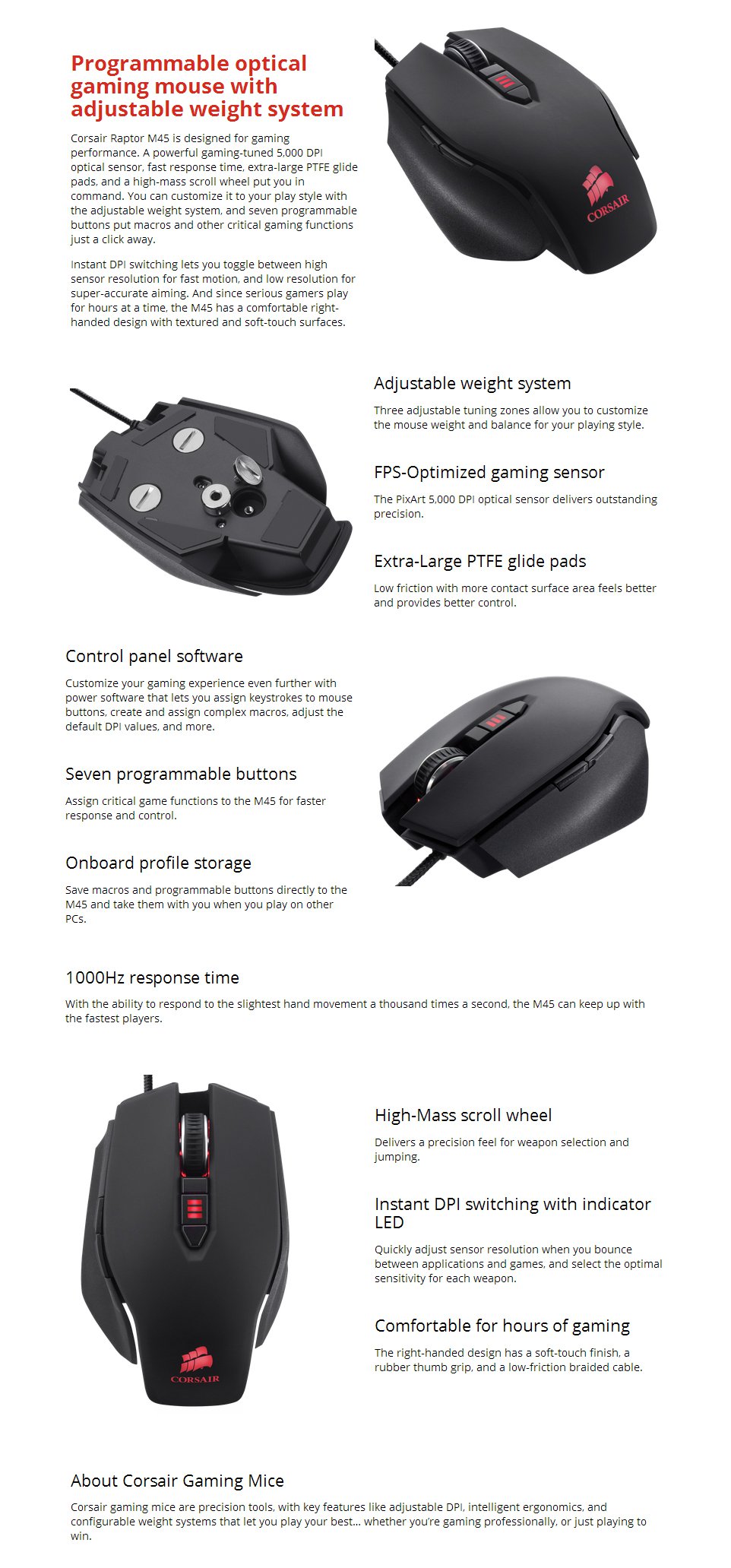 Corsair Raptor M45 Optical Gaming Mouse - Black - PixArt 5000 DPI Optical Sensor - 7 Programmable Buttons - 1000Hz Response Time - Three Adjustable Weight System - Extra-Large PTFE Glide Pads - Control Panel Software - 2 Years Warranty (CH-9000052-NA)