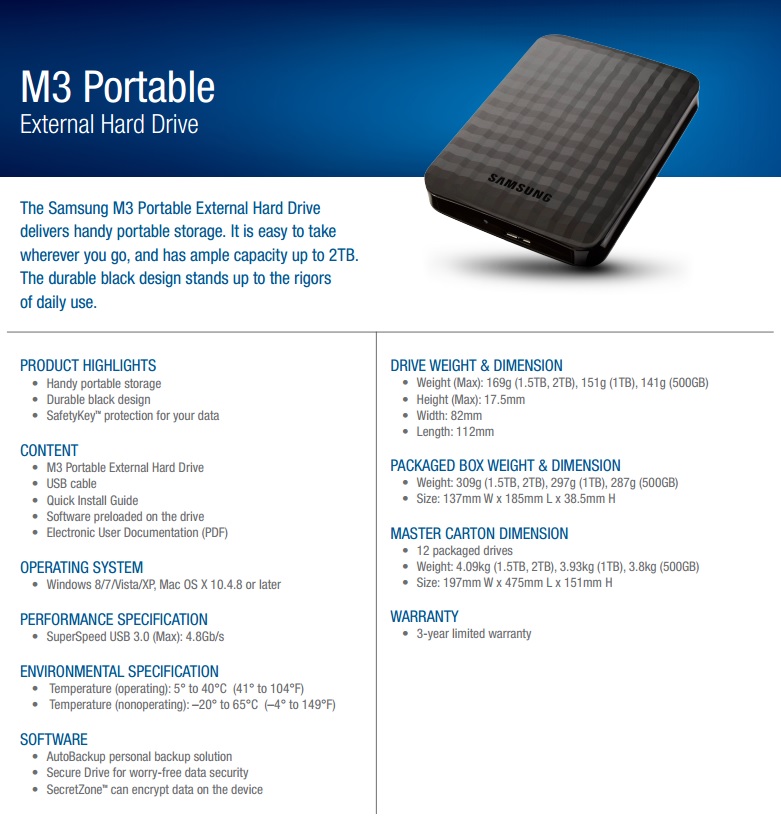 Samsung M3 Portable External Hard Drive Black - 1TB - USB 3.0 - Windows 8/7/Vista/XP, Mac OS X 10.4.8 or later - 3 Year Limited Warranty - STSHX-M101TCB