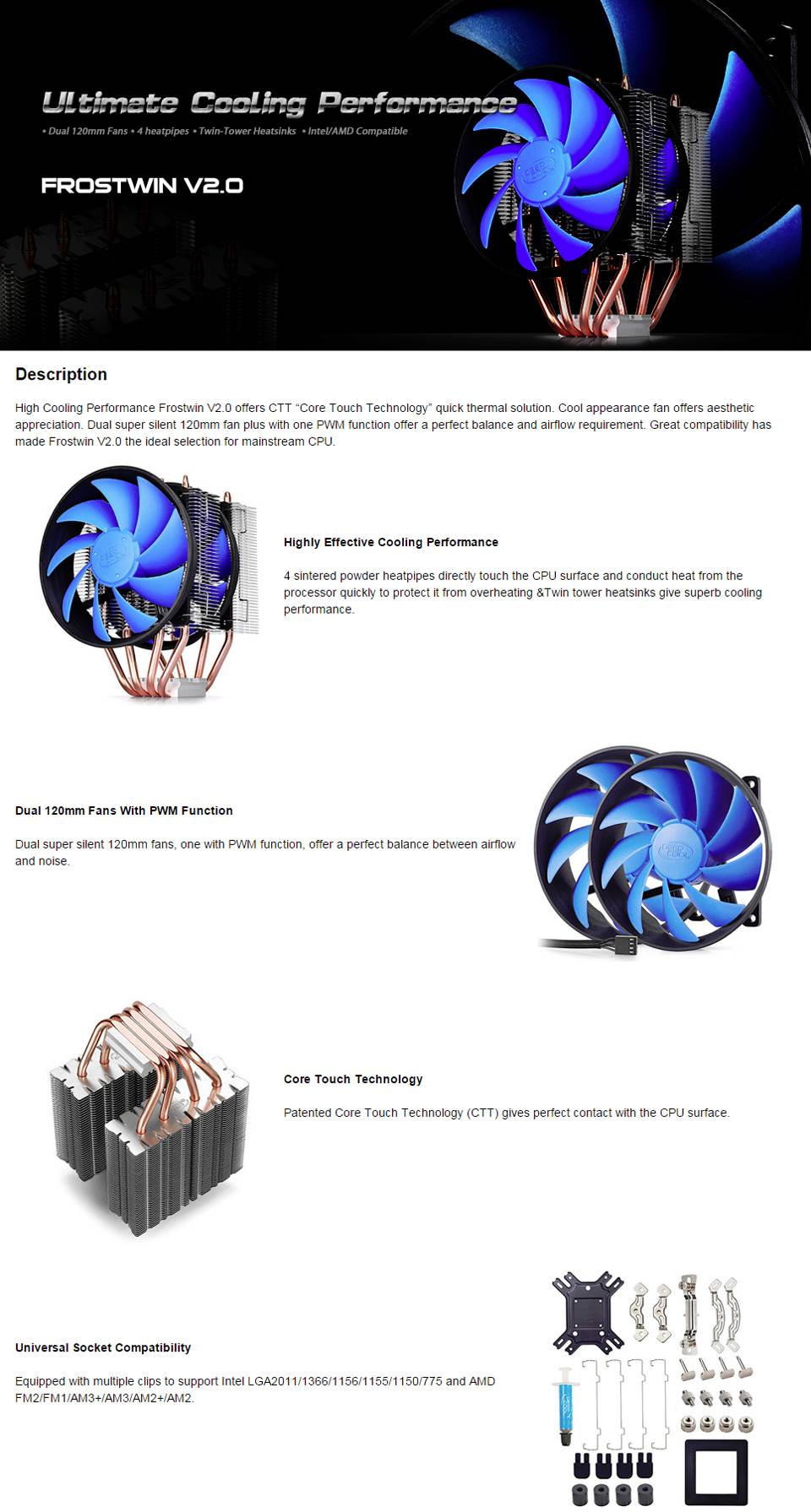 Deepcool Frostwin V2 Multi-Socket PWM CPU Cooler - Supports Intel and AMD Sockets - 2x 120mm PWM Fans - 4x Heatpipes - DP-MCH4-FTV2