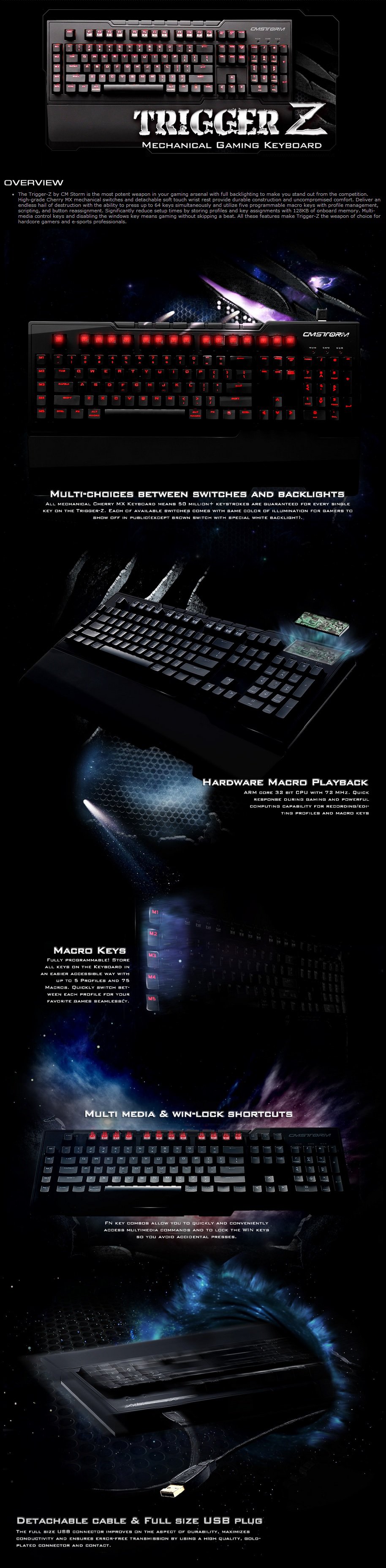 Cooler Master CM Storm Trigger Z Mechanical Keyboard - Cherry MX Brown - Fully programmable! Save up to 5 Profiles and 75 Macros on the Keyboard - On the fly Macro recording � record and use key combos without leaving the game - Detachable wrist rest amd braided USB cable - Online firmware updates - 64 KRO - 64 simultaneous key presses