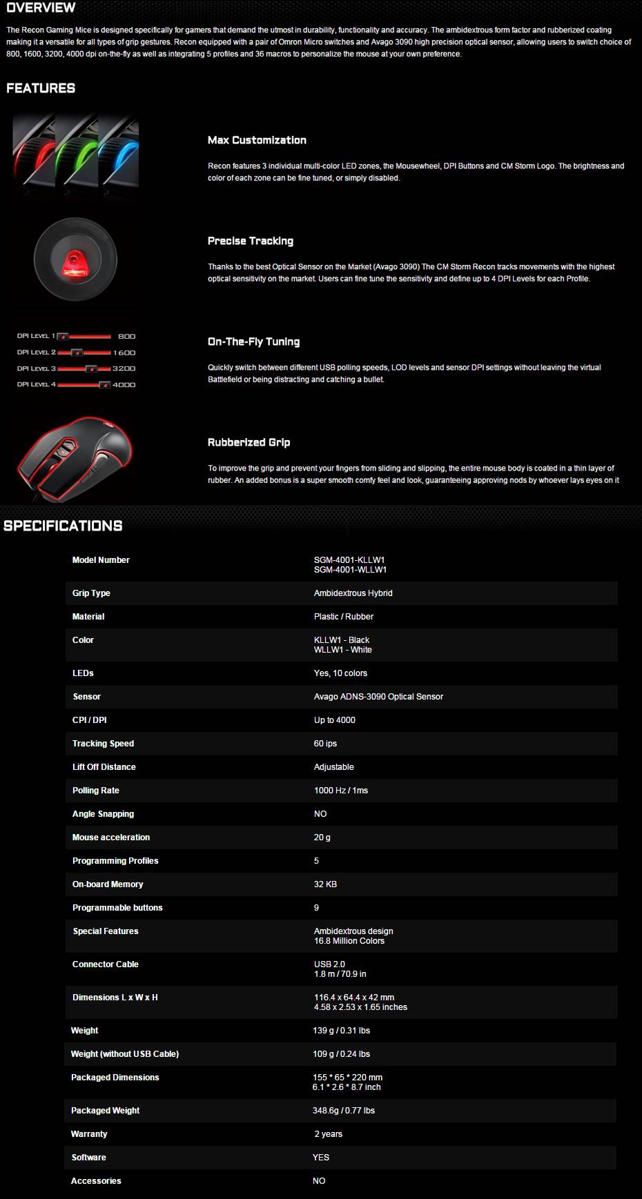 Cooler Master CM Storm Recon Optical Gaming Mouse - Avago 3090 Optical Sensor - Lift Off Distance: Adjustable - Japanese Omron Micro Switches - 800-400DPI - 1000Hz Polling Rate - Dimensions: 116.4 x 64.4 x 42 mm - Weight: 109g without USB Cable - 2 Year Warranty