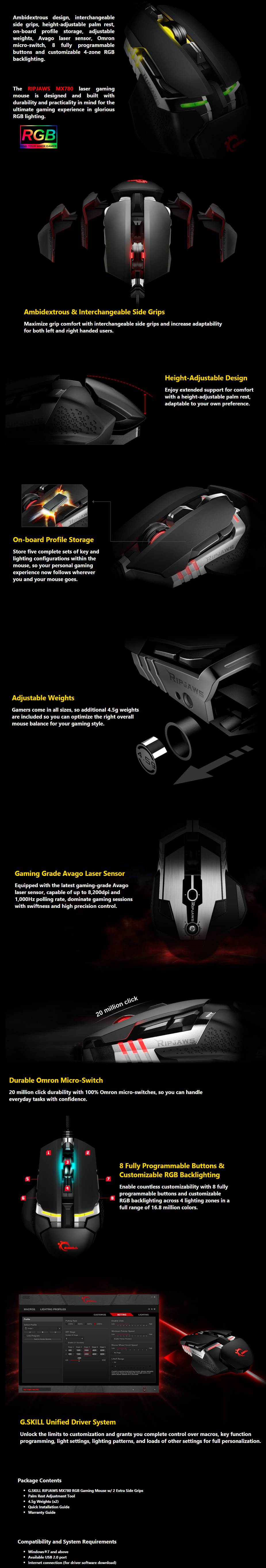 G.Skill Ripjaws MX780 RGB Laser Gaming Mouse - Black - 8200 DPI with Avago Laser Sensor - 16.8 Million Colour Customizable 4-Zone Backlighting - 125Hz/250Hz/500Hz/1000Hz Polling Rates - Onboard Profile Storage - Selectable Response Time - Rubberized Scroll Wheel - Adjustable Weight System - PTFE Glide Pads - Aluminium Unibody Design