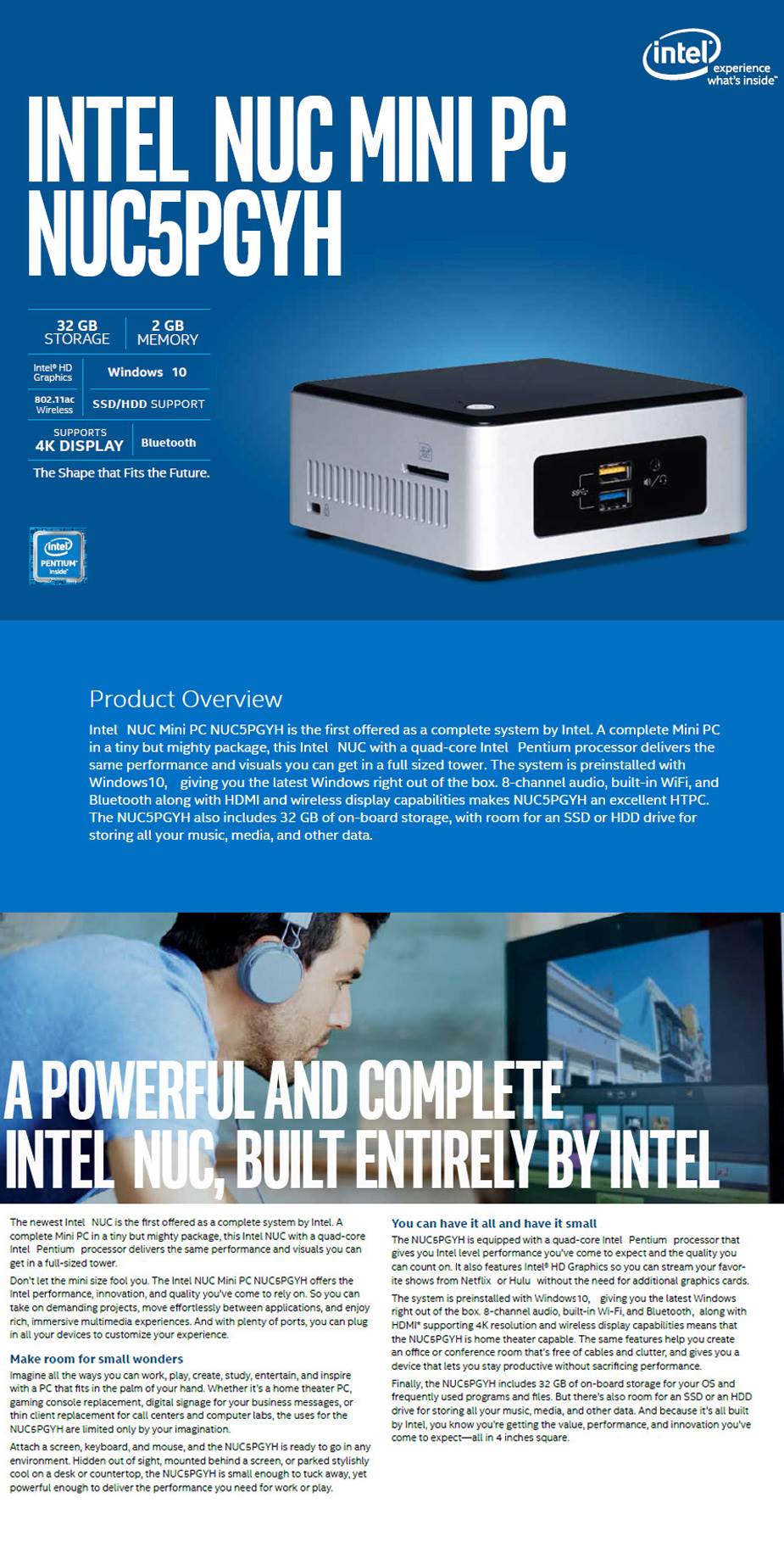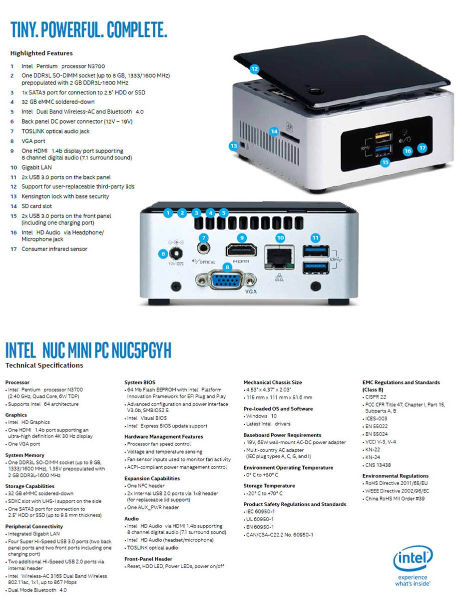 Intel NUC5PGYH NUC Mini PC - Pentium N3700 1.60 GHz (Burst: 2.40 GHz) - 2GB DDR3 SODIMM RAM - 32GB On-Board Storage - Support 2.5