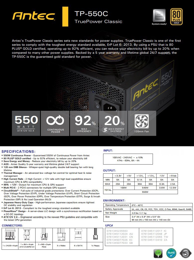 Antec True Power Classic TPC-550 550W 80 Plus Power Supply - 80 Plus Gold Certified - 120mm DBB Silence - Thermal Manager - Multi GPU Support - ATX 12V v2.4 - 5 Year Warranty (TPC-550)