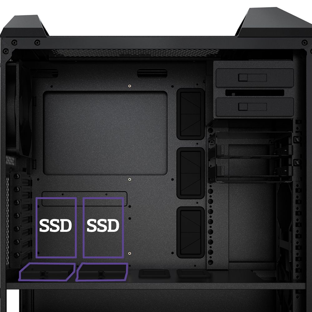 The first Cooler Master case to incorporate two easy to install slip-and-clip solid-state drive pockets (2.5¡±) with four easy mounting positions. Showcase them on the partition panel or hide them behind the motherboard tray for a cleaner look. | | |