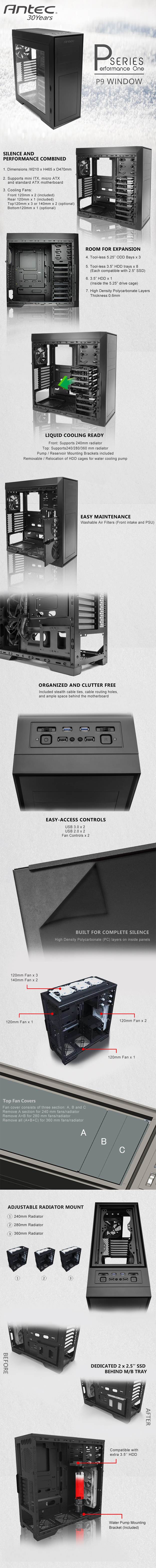 Antec P-Series P9W Window Mid Tower Case - Black - 3x 5.25