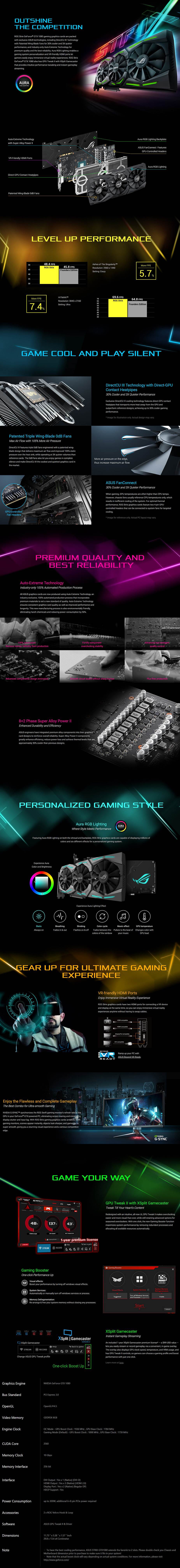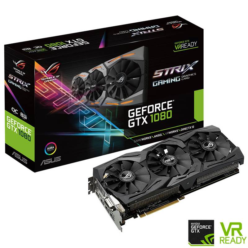 ASUS GeForce GTX 1080 ROG Strix Gaming OC 8GB Video Card - 8GB GDDR5X 256 bit - OC Mode Boost/Base: 1936 MHz/1784 MHz, Gaming Mode Boost/Base Clock: 1898 MHz/1759 MHz - 2x HDMI 2.0, 2x DisplayPort, 1x DVI-D - DirectCU III - PCI-E 3.0 x16 - Nvidia Ansel, Nvidia G-Sync, Nvidia GameWorks, Nvidia GPU Boost 3.0, Vulkan API - DirectX 12, OpenGL 4.5 - ROG STRIX-GTX1080-O8G-GAMING