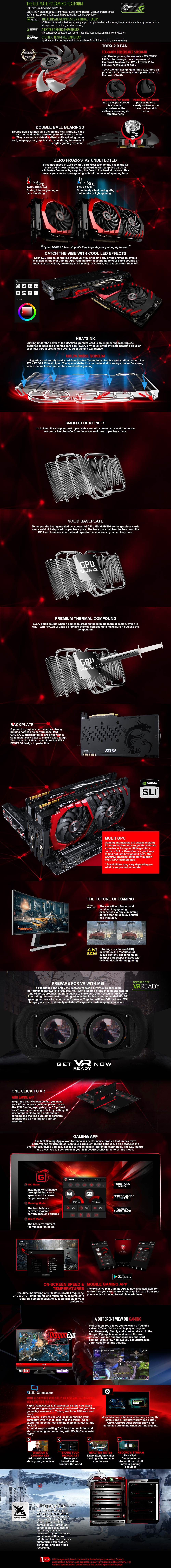 | MSI GeForce GTX 1080 Gaming X 8GB Video Card - 8GB 256 bit GDDR5X - GPU Clocks (Boost/Base Core Clock): 1847MHz/1708MHz (OC Mode), 1822MHz/1683MHz (Gaming Mode), 1733MHz/1607MHz (Silent Mode) - Memory Clock Speed: 10,000MHz - 3x DisplayPort (Version 1.4), 1x HDMI (Version 2.0), 1x Dual-Link DVI-D - PCI-E 3.0 x16 - 6+8 pin Power - Nvidia Ansel, Nvidia G-Sync, Nvidia GameWorks, Nvidia GPU Boost 3.0, Vulkan API - DirectX 12, OpenGL 4.5 |