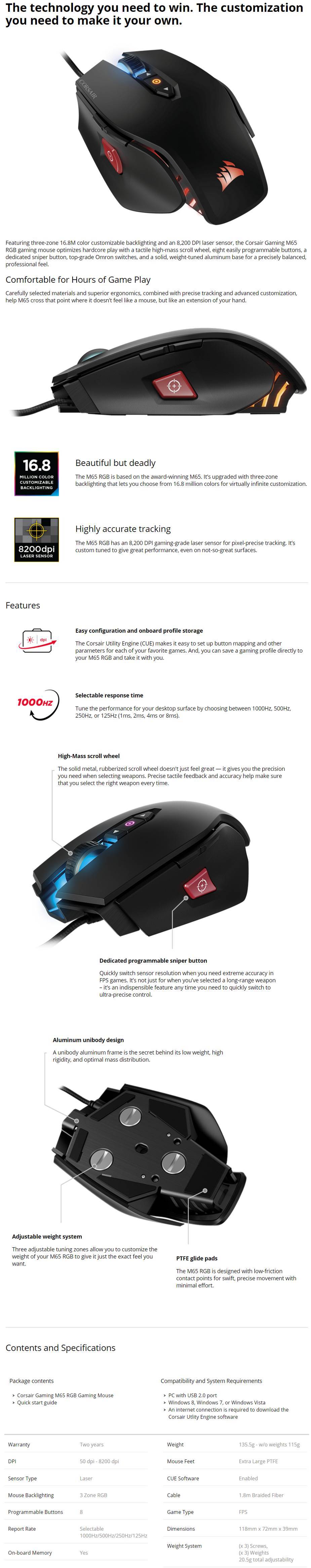 Corsair Gaming M65 Pro RGB FPS Optical Gaming Mouse - Black - Pixart PMW336X Sensor - 12000 DPI - 16.8 Million Colour Customizable Backlighting - Onboard Profile Storage - Selectable Response Time - Rubberized Scroll Wheel - Programmable Sniper Button - Adjustable Weight System - PTFE Glide Pads - Aluminium Unibody Design - CH-9300011-AP