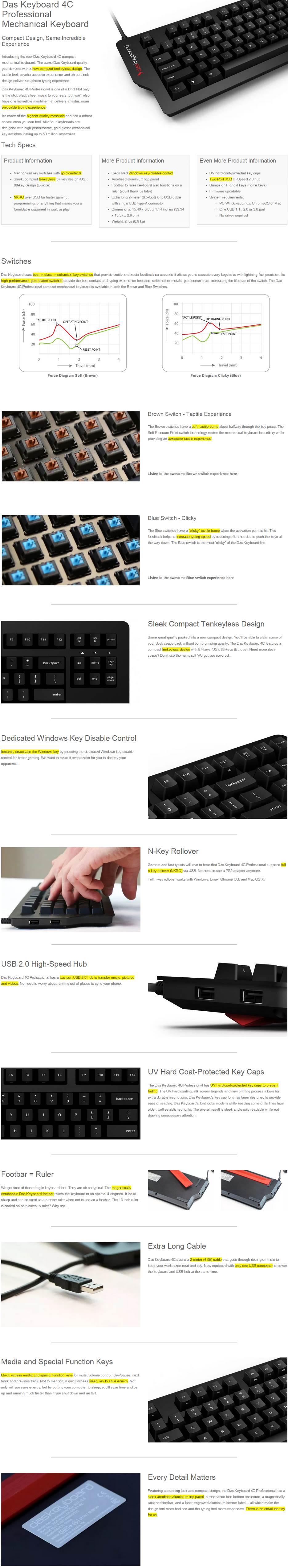 Das Keyboard 4C Professional Compact Mechanical Keyboard - Brown Switch - Mechanical key switches with gold contacts - 2x USB Hi-Speed 2.0 hub - 2.0m USB cable with single USB type-A connector