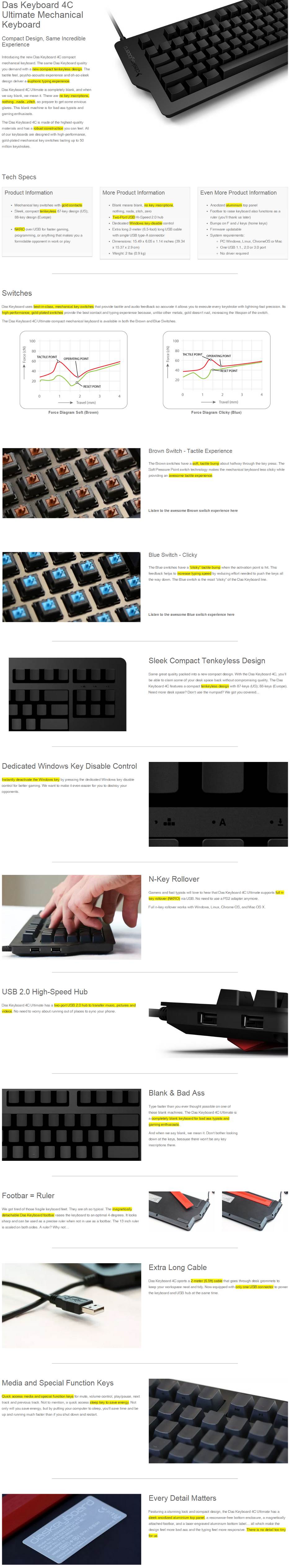 Das Keyboard 4C Ultimate Compact Mechanical Keyboard - Brown Switch - Mechanical key switches with gold contacts - 2x USB Hi-Speed 2.0 hub - 2.0m USB cable with single USB type-A connector