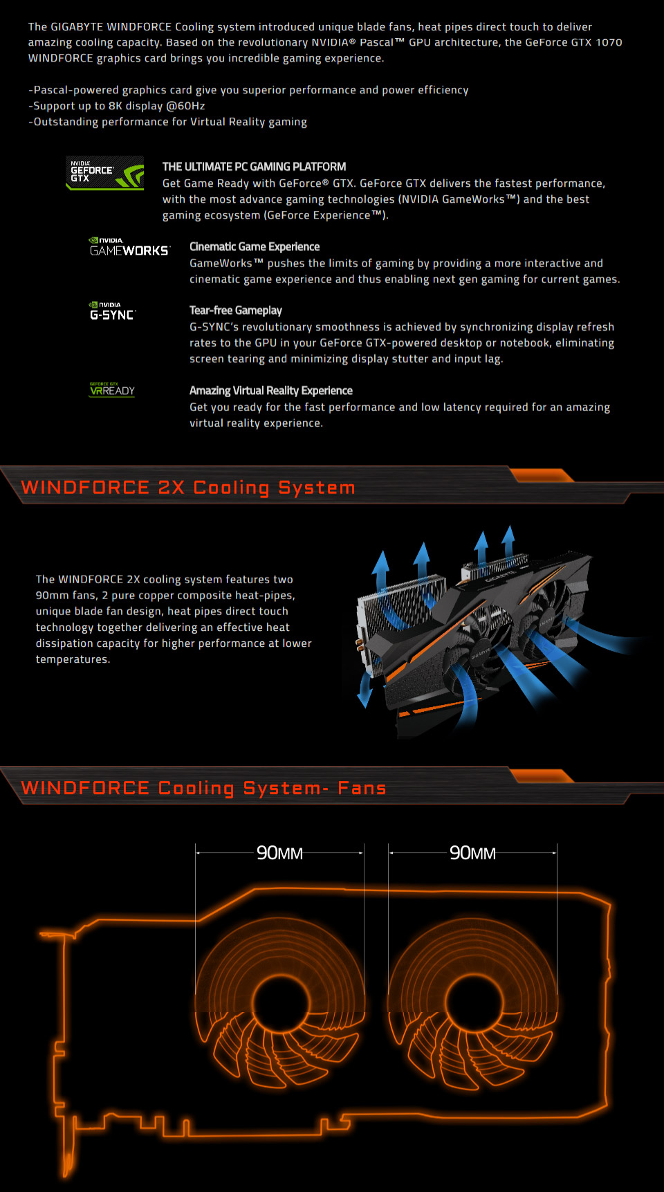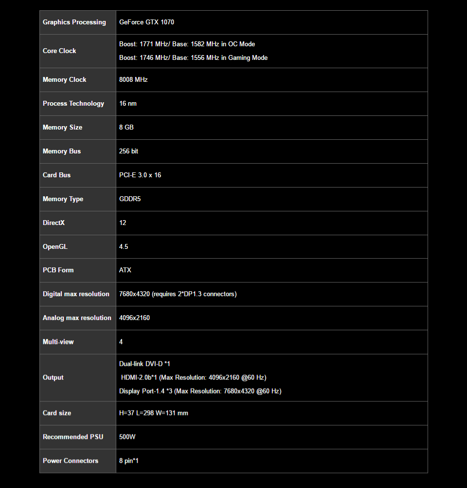 Gigabyte GeForce GTX 1070 WINDFORCE OC 8GB Video Card - 8GB 256 bit GDDR5 - GPU Clocks: Boost: 1771 MHz/ Base: 1582 MHz in OC Mode, Boost: 1746 MHz/ Base: 1556 MHz in Gaming Mode - Memory Clock: 8008 MHz - 3x DisplayPort (Version 1.4), 1x HDMI (Version 2.0), 1x Dual-Link DVI-D - PCI-E 3.0 x16 - 1x 8 pin Power - Nvidia Ansel, Nvidia G-Sync, Nvidia GameWorks, Nvidia GPU Boost 3.0, Vulkan API - DirectX 12, OpenGL 4.5 - GV-N1070WF2OC-8GD