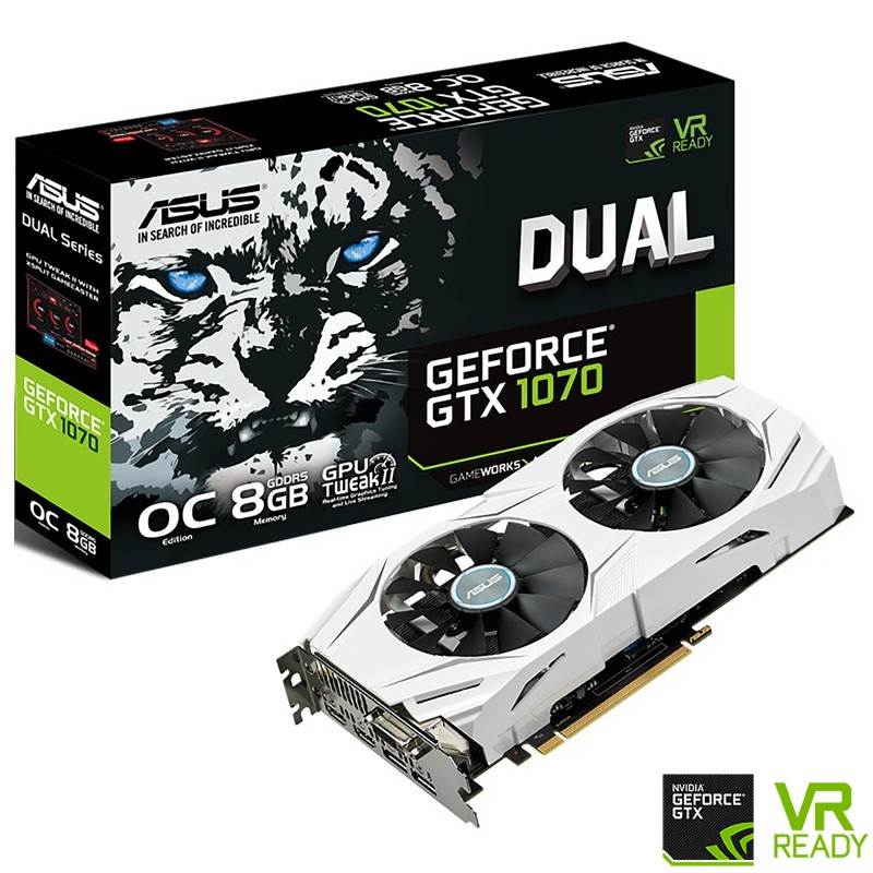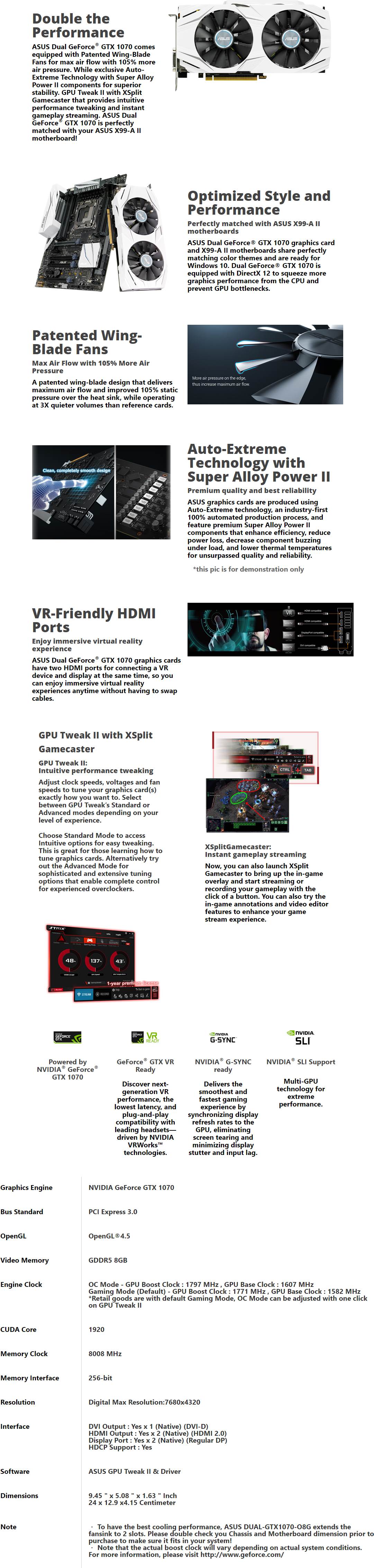 ASUS GeForce GTX 1070 DUAL OC 8GB Video Card - 8GB 256 bit GDDR5 - GPU Core Clock (Boost/Base): OC Mode: 1797MHz/1607MHz, Gaming Mode (Default): 1771MHz/1582MHz - Memory Clock Speed: 8008MHz - 2x DisplayPort (Version 1.4), 2x HDMI (Version 2.0), 1x Dual-Link DVI-D - PCI-E 3.0 x16 - 8 pin Power - Nvidia Ansel, Nvidia G-Sync, Nvidia GameWorks, Nvidia GPU Boost 3.0, Vulkan API - DirectX 12, OpenGL 4.5 - 3 Years Limited Warranty
