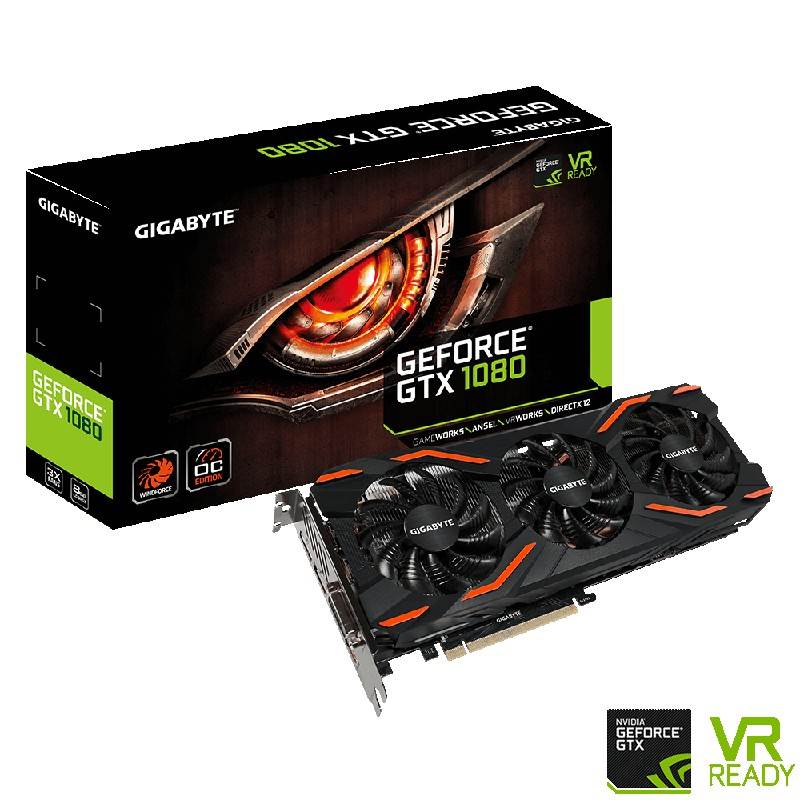 Gigabyte GeForce GTX 1080 Windforce OC 8GB Video Card - 8GB GDDR5X 256 bit - GPU Clock: 1797MHz (boost) 1657MHz (Base) OC Mode, 1771MHz (boost) 1632MHz (Base) Gaming mode - Memory Clock: 10010MHz - 1x HDMI 2.0b, 3x DisplayPort 1.4, 1x DVI-D - PCI-E 3.0 x16 - 1x 8pin Power - Nvidia Ansel, Nvidia G-Sync, Nvidia GPU Boost 3.0, Vulkan API - DirectX 12, OpenGL 4.5
