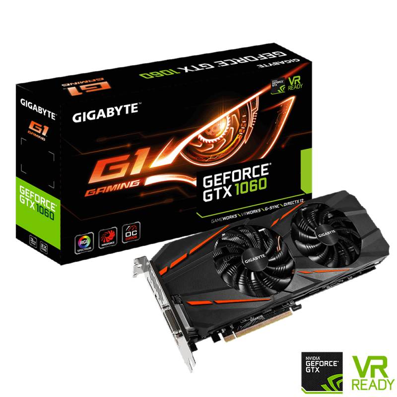 Gigabyte GeForce GTX 1060 G1 Gaming 3GB Video Card - 3GB 192 Bit GDDR5 - GPU Clock: Boost/Base in OC mode: 1847 MHz/1620 MHz, Boost/Base in Gaming Mode: 1809 MHz/1594 MHz - Memory Clock: 8008 MHz - PCI-E 3.0 x16 - 1x DVI-D, 1x HDMI 2.0b, 3x Display Port 1.4 - 1x 8-pin - VR Ready - NVIDIA Ansel - DirectX 12 - OpenGL 4.5 - 3 Years Limited Warranty