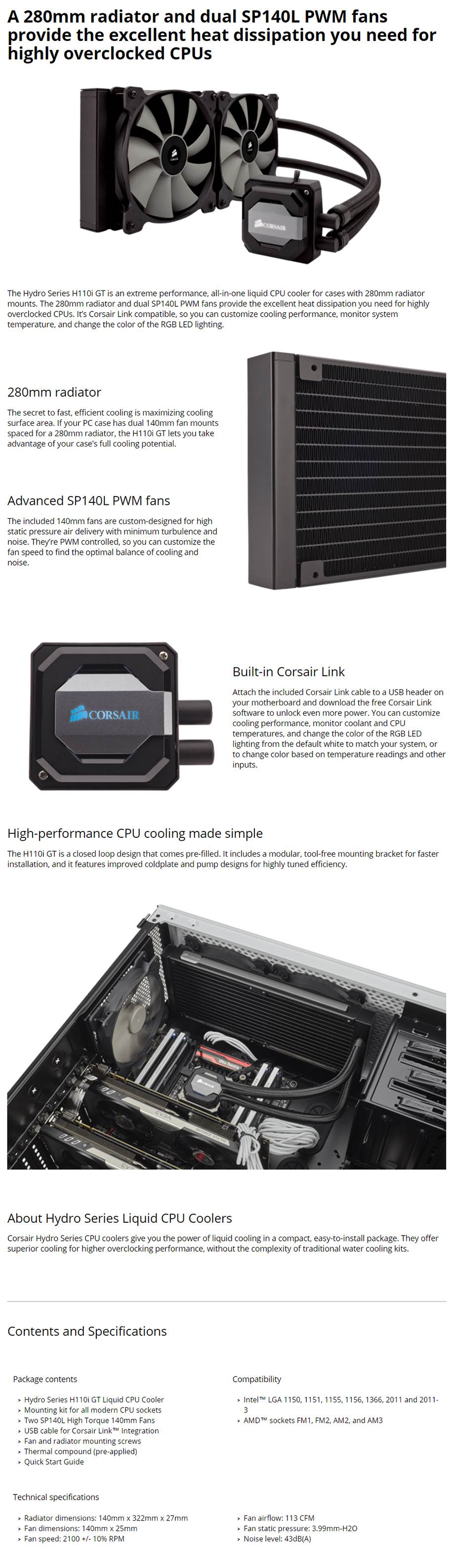 Corsair Hydro Series H110i GT Liquid CPU Cooler - AMD: AM2, AM3, FM1, FM2, Intel LGA: 1150, 1155, 1156, 1366, 2011, 2011-3 - 280mm Radiator - Advanced SP140L PWM fans - Corsair Link