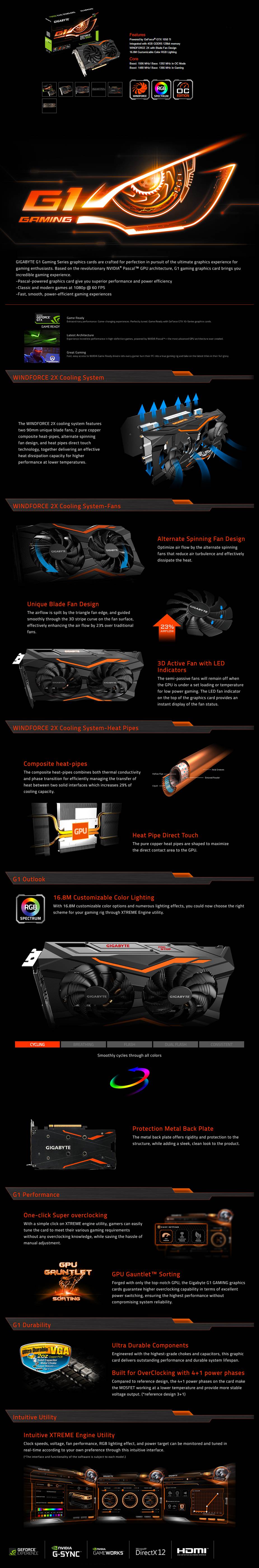 Gigabyte GeForce GTX 1050 Ti G1 Gaming 4GB Video Card - 4GB 128 bit GDDR5 - GPU Clock Boost/Base: Boost: 1506 MHz/ Base: 1392 MHz (OC Mode), Boost: 1480 MHz/ Base: 1366 MHz (Gaming) - Memory Clock: 7008MHz - 1x DisplayPort (Version 1.4), 3x HDMI (Version 2.0B), 1x Dual-Link DVI-D - PCI-E 3.0 x16 - Nvidia G-Sync, Nvidia GameWorks, Nvidia GPU Boost 3.0, Vulkan API - DirectX 12, OpenGL 4.5 - 6-Pin Connector - N105TG1-GAMING-4GD - 3 Years Limited Warranty
