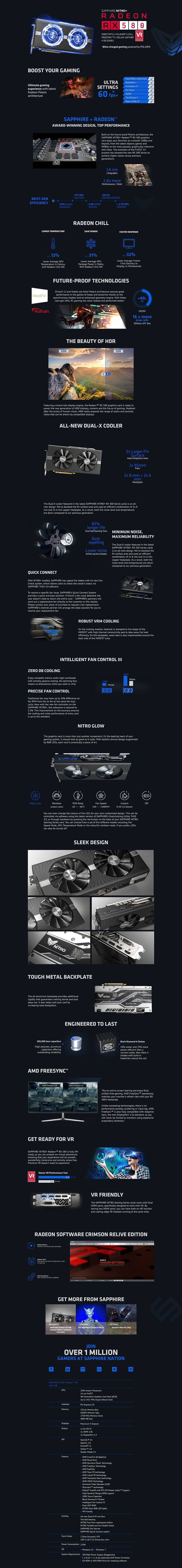 Sapphire Radeon RX 580 NITRO+ OC 4GB Video Card - 4GB GDDR5 256-bit - GPU Clock: 1411MHz - Effective Memory Clock: 7000MHz - 2x DisplayPort 1.4, 2x HDMI 2.0, 1x DVI-D - PCI-Express 3.0 - Stream Processors: 2304 - 1x 8-pin and 1x 6-pin Power Connectors - DirectX 12 - OpenGL 4.5 - 11265-07-20G - 2 Years Limited Warranty