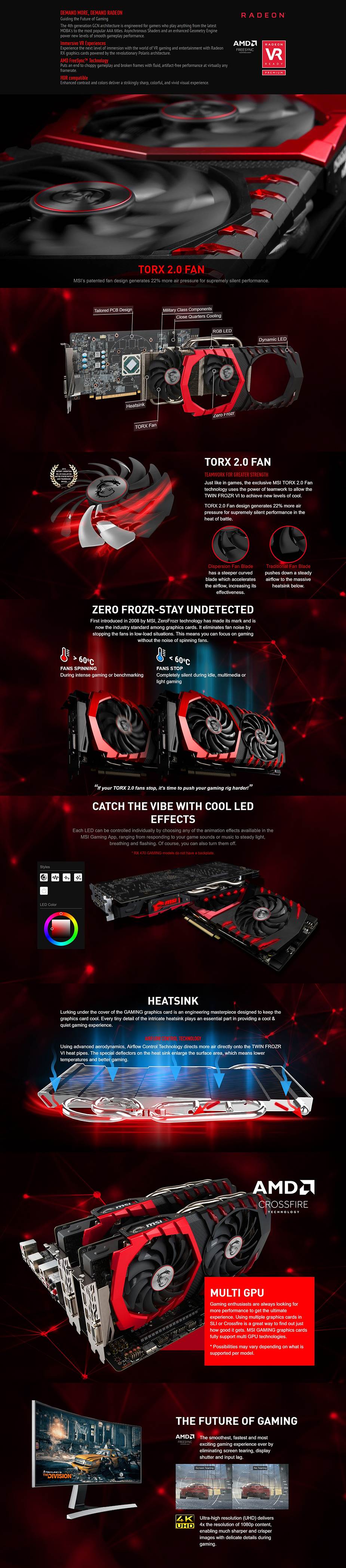 MSI Radeon RX 570 Gaming X 4GB Video Card - 4GB GDDR5 256-bit - OC Mode Clock: 1293MHz, Gaming Mode Clock: 1281MHz, Silent Mode Clock: 1244MHz - Memory Clocks: 7100MHz (OC Mode), 7000MHz (Gaming/Silent Mode) - 2x DisplayPort 1.4, 2x HDMI 2.0, 1x DVI-D - PCI-Express 3.0 - Stream Processors: 2048 - 1x 8-pin Power Connector - DirectX 12 - OpenGL 4.5 - 3 Years Limited Warranty