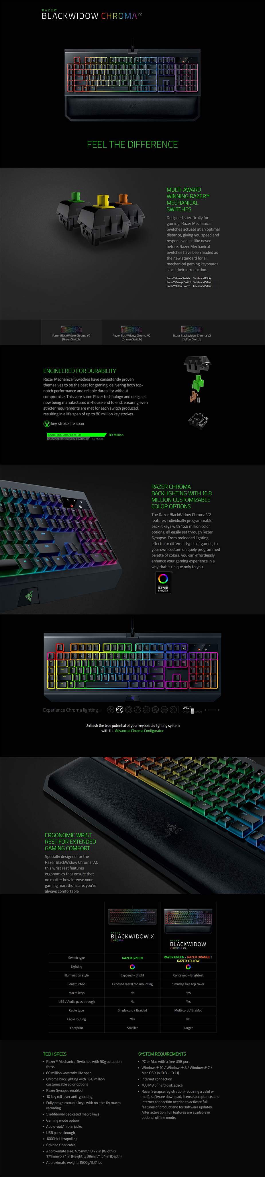 Razer BlackWidow Chroma V2 Mechanical Gaming Keyboard - Green Switch - Macro Keys - USB/Audio Pass Through - USB - Black - RZ03-02030100-R3M1