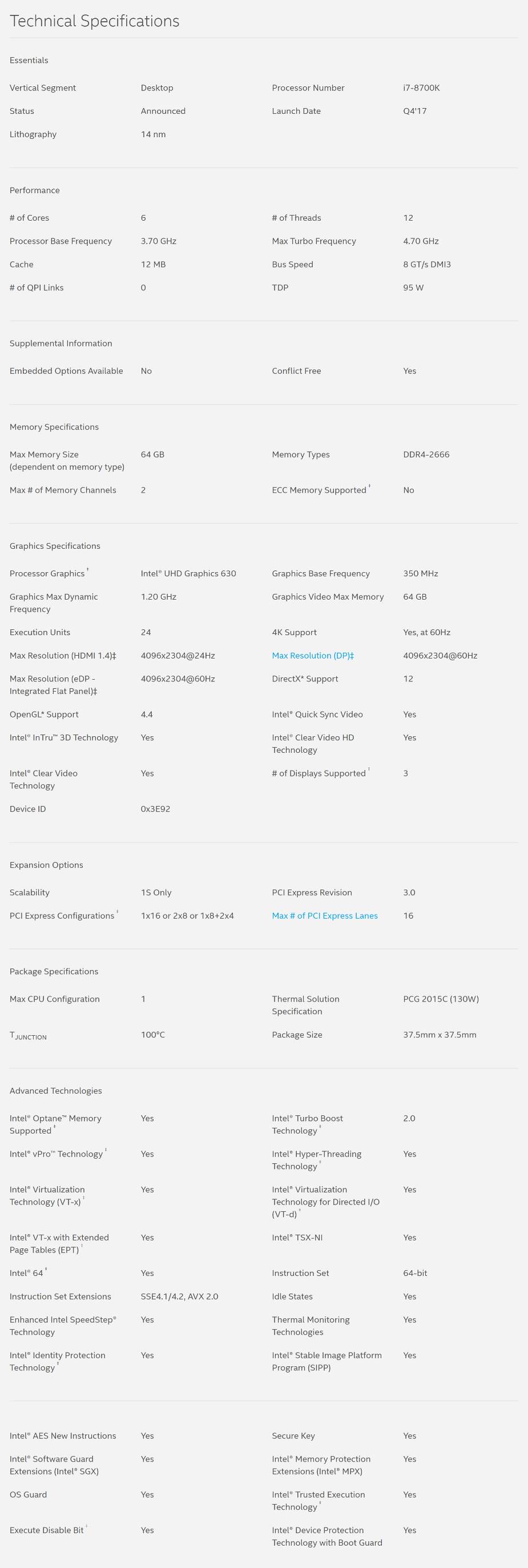 Intel Core i7 8700K Hex Core LGA 1151-2 3.70 GHz Unlocked CPU Processor - 6 Cores - 12 Threads - Frequency: 3.70 GHz - Turbo Boost: 4.70 GHz - L2 Cache 1.5 MB (256 KB per Core) - L3 Cache 12 MB - TDP: 95W - BX80684I78700K - 3 Years Limited Warranty