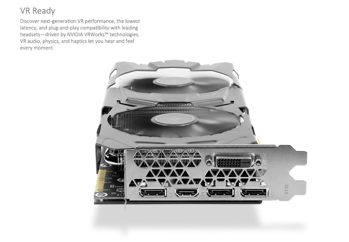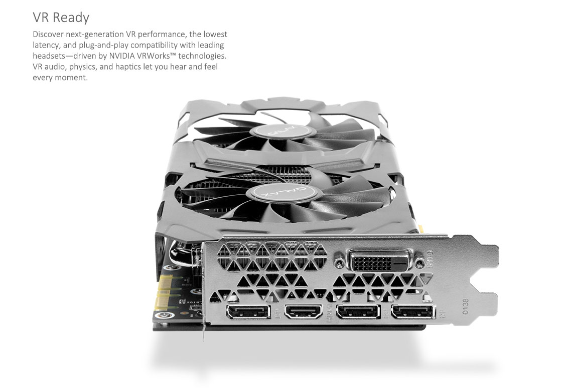 The GALAX GeForce GTX 1070 EX graphics card offers a new groundbreaking design for the gaming elite and blazing fast clock speeds right out of the box. This card is packed with innovative new gaming technologies, making it the perfect choice for the latest high-definition games and is VR Ready.