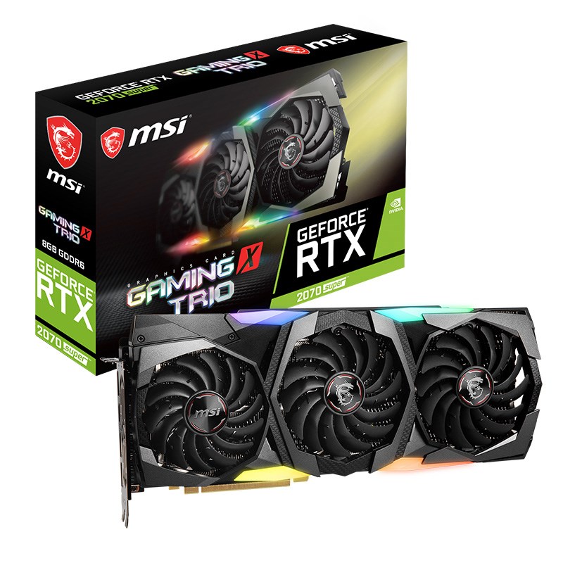 The MSI GeForce RTX 2070 SUPER GAMING X TRIO 8GB  (GeForce RTX 2070 SUPER GAMING X TRIO) allows you to play your favourite games in realistically-rendered virtual worlds. With 2560 CUDA cores, eight gigabytes of video memory, and a PCIe 3.0 interface, the MSI RTX 2070 SUPER GAMING X TRIO video card gives the most defined and detailed visuals for your gaming pleasure. Three Torx 3.0 fans and a die-cast sheet for the PCB provide active and passive cooling to protect the graphics card from overheating.
